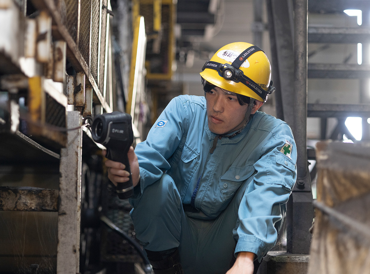 私は入社以来、火力発電に携わる舞鶴事業所に勤務しています。入社後の4年間は技術課排水係として排水処理設備の運転を担当し、火力発電所で使用した水を浄化する作業を担っていました。燃料係に異動になったのは5年目からで、現在は発電設備に付帯する共用設備や灰の処理設備、船から揚げた石炭を運ぶ「揚運炭(よううんたん)」という設備の巡視・清掃・トラブル対応・簡易保守を行っています。設備の巡視では動いている機械の状態を目で見て、耳で聞いて不具合をいち早く見つけ出すんですが、まだまだ経験が浅いので、先輩の指導を受けながらスキルアップを図っています。