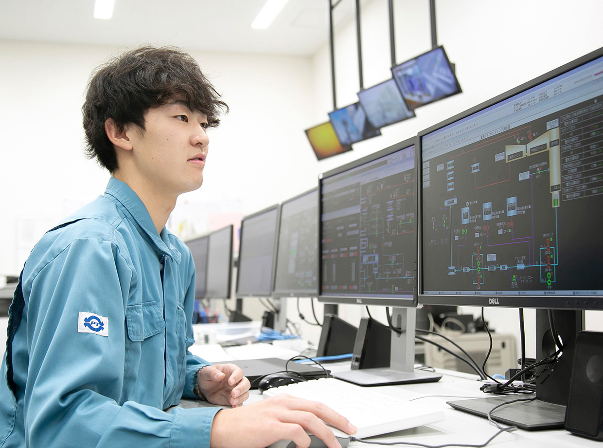 現在は発電業務に携わっています。設備の点検や発電状況の監視、設備で使用する薬品の受け入れなどが主な業務です。心がけているのは、ポンプやモーターの音をしっかりと聴き分けること。正常な音を覚えていれば、音の違いで設備異常が早期発見できますし、中央操作室では正常な数値データを覚えることで、異常の有無がわかります。入社当初に比べると、その違いが比較できるようになり、隅々まで点検・監視できるようになったことに成長を感じています。